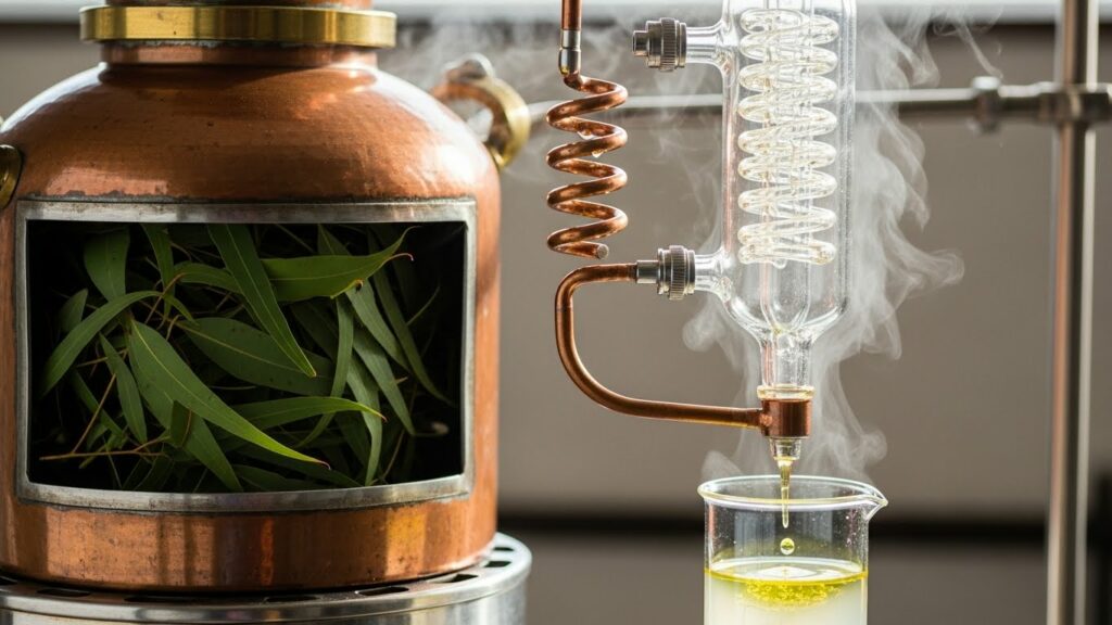 Eucalyptus essential oil is extracted through steam distillation of fresh eucalyptus leaves. The distillation process captures the oil’s high cineole content, which gives eucalyptus its strong, cooling, and penetrating aroma.